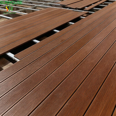 Tekstur permukaan diterapkan melalui proses finishing tiga tahap yang menggabungkan embossing 3D, sanding, dan sikat.Pendekatan berlapis ini menghasilkan permukaan yang dibaca sebagai kayu alami baik secara visual maupun di bawah kaki, dengan tekstur mikro yang cukup untuk mempertahankan pegangan dalam kondisi basah.HDPE resin dan UV stabiliser aditif dikombinasikan ke dalam tubuh papan sebelum ekstrusi tahan cuaca dan stabilitas warna dibangun ke dalam struktur material, tidak bergantung pada perawatan permukaan yang terdegradasi dari waktu ke waktu.